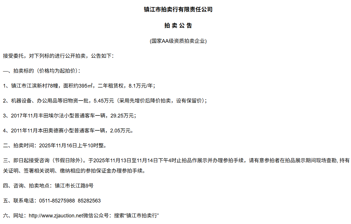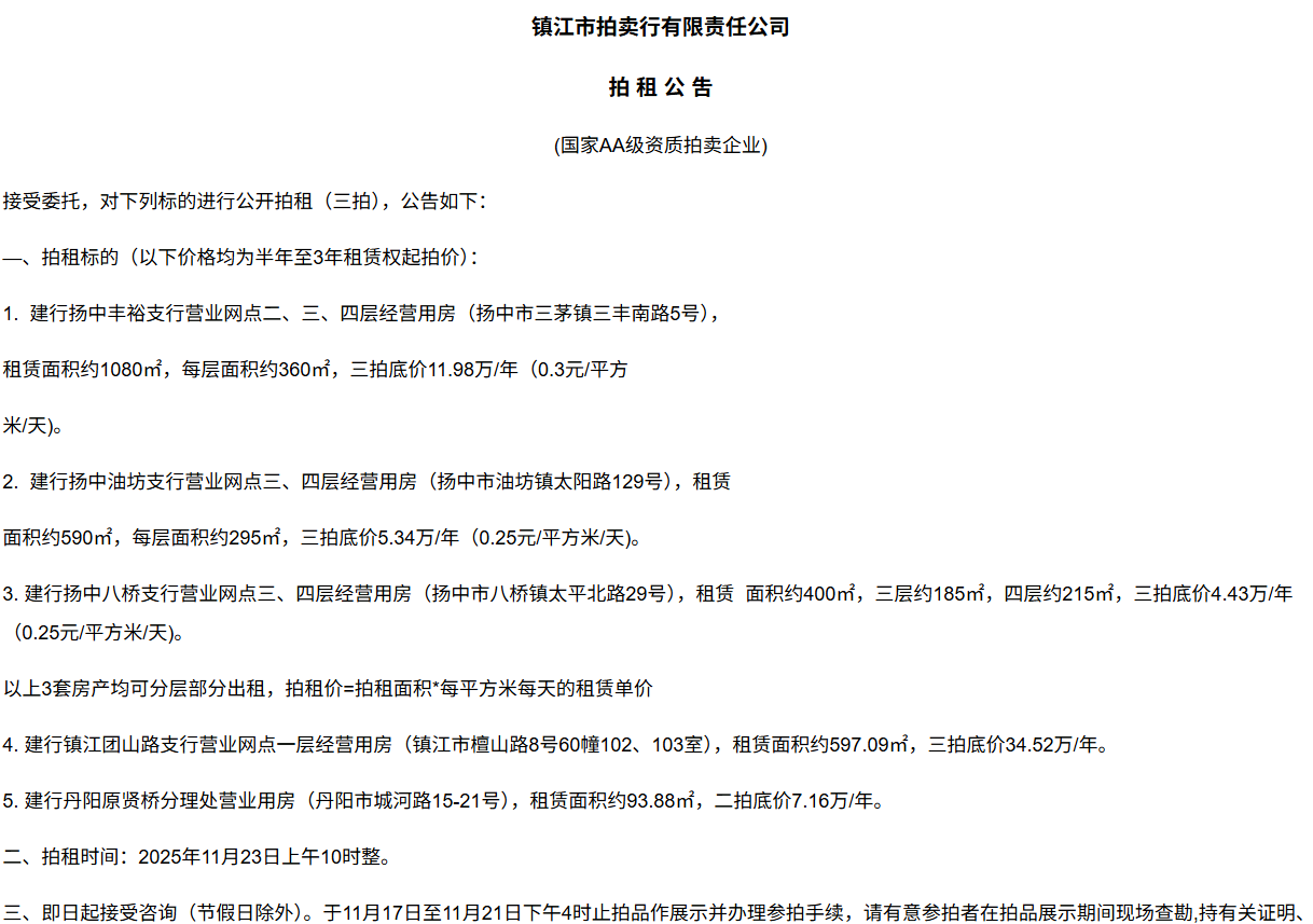 鎮江市拍賣行有限責任公司拍 租 公 吿(國家AA級資質拍賣企業)接受委托,對下列標的進行公開拍租(三拍),公告如下:—、拍租標的(以下價格均為半年至3年租賃權起拍價):1.  建行揚中豐裕支行營業網點二、三、四層經營用房(揚中市三茅鎮三豐南路5號),租賃面積約1080㎡,每層面積約360㎡,三拍底價11.98萬/年(0.3元/平方米/天)。2.  建行揚中油坊支行營業網點三、四層經營用房(揚中市油坊鎮太陽路129號),租賃面積約590㎡,每層面積約295㎡,三拍底價5.34萬/年(0.25元/平方米/天)。3. 建行揚中八橋支行營業網點三、四層經營用房(揚中市八橋鎮太平北路29號),租賃  面積約400㎡,三層約185㎡,四層約215㎡,三拍底價4.43萬/年(0.25元/平方米/天)。以上3套房產均可分層部分出租,拍租價=拍租面積*每平方米每天的租賃單價4. 建行鎮江團山路支行營業網點一層經營用房(鎮江市檀山路8號60幢102、103室),租賃面積約597.09㎡,三拍底價34.52萬/年。5. 建行丹陽原賢橋分理處營業用房(丹陽市城河路15-21號),租賃面積約93.88㎡,二拍底價7.16萬/年。二、拍租時間:2025年11月23日上午10時整。三、即日起接受咨詢(節假日除外)。于11月17日至11月21日下午4時止拍品作展示并辦理參拍手續,請有意參拍者在拍品展示期間現場查勘,持有關證明、簽署相關說明、繳納相應的參拍保證金辦理參拍手續。四、咨詢、拍租地點:鎮江市長江路9號五、聯系方式:0511-85275988   13655299933楊先生六、網址:http://www_zjauction_net.vw8848.cn;微信公眾號:搜索“鎮江市拍賣行” 拍品清單2025.11.23序號名稱起拍價(元)標的說明1建行揚中豐裕支行營業網點二、三、四層經營用房(揚中市三茅鎮三豐南路5號),租賃面積約1080㎡,每層面積約360㎡三拍底價11.98萬/年(0.3元/平方米/天)1、1-3號房產均可分層部分出租,拍租價=拍租面積*每平方米每天的租賃單價;2、意向競拍人在拍賣前需持營業執照或身份證與委托方說明租賃房產經營業態,確定意向后出具房產承租用途承諾書,經委托方審核后,方可交納保證金參加競拍;3、租賃期限為半年至3年(承租方與出租方協商而定),承租方每半年或一年結付租金,租賃期間的水、電費用及其它相關費用均由承租方承擔;4、承租方不得用于經營和保管危險物品,不得用于開設餐飲、娛樂等可能嚴重影響消防安全、運營安全的經營業態,不得用于經營委托貸款、小額貸款等可能冒用委托方名義,帶來聲譽風險的經營業態。租賃期內,承租方不得破壞墻體結構,自行成就消防、安全等使用條件,不得擅自將租賃房屋轉租、轉讓給他人使用,否則委托方有權收回房屋;5、拍租成交后,承租方將租金交至出租方指定賬戶,傭金交至拍賣方賬戶(拍租傭金為該房屋一個月租金)。承租方憑租賃合同無息退還保證金。2建行揚中油坊支行營業網點三、四層經營用房(揚中市油坊鎮太陽路129號),租賃面積約590㎡,每層面積約295㎡三拍底價5.34萬/年(0.25元/平方米/天)3建行揚中八橋支行營業網點三、四層經營用房(揚中市八橋鎮太平北路29號),租賃面積約490㎡,每層面積約245㎡三拍底價4.43萬/年(0.25元/平方米/天)4建行鎮江團山路支行營業網點一層經營用房(鎮江市檀山路8號60幢102、103室),建筑面積約597.09㎡三拍底價34.52萬/年5建行丹陽原賢橋分理處營業用房(丹陽市城河路15-21號),建筑面積約93.88㎡二拍底價7.16萬/年